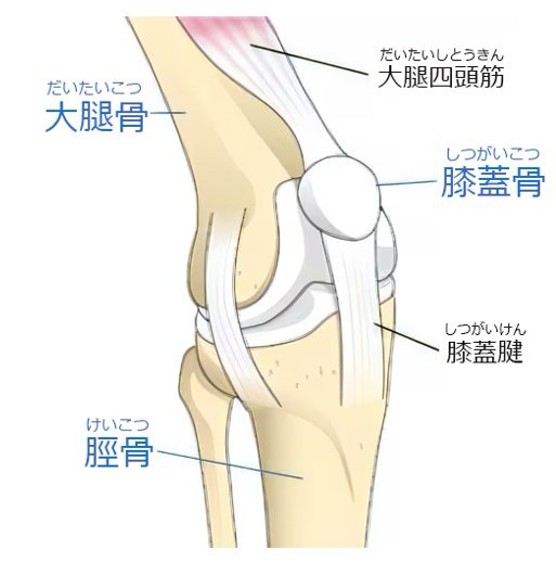 膝関節は、「大腿骨(太ももの骨)」、「脛骨(すねの骨)」、「膝蓋骨(お皿の骨)」からなる関節です。膝関節の周りにはさまざまな筋肉や靭帯があり、安定性を保ったまま曲げ伸ばしをすることができます。正常な膝関節の骨の表面は「関節軟骨」というクッションで覆われており、痛みなく滑らかに関節を動かすことができます。膝関節は「関節包」という袋に包まれており、その中にある「関節液」という液体が潤滑油の働きをしています。
