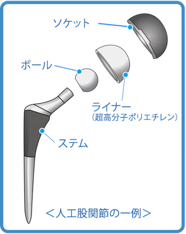手術では、まず変形した大腿骨頭を根元から切除し、傷んだ寛骨臼の表面の骨を削って取り除きます。寛骨臼側には金属のカップを骨に固定し、そのカップの内側に超高分子量ポリエチレン製の人工の軟骨(ライナー)をはめ込みます。大腿骨側には杭状の金属(ステム)を骨の中に挿入し、その先にセラミック製の人工の骨頭(ヘッド)を設置します。人工股関節はライナーとヘッドの間で滑らかに動く構造になっています。
