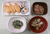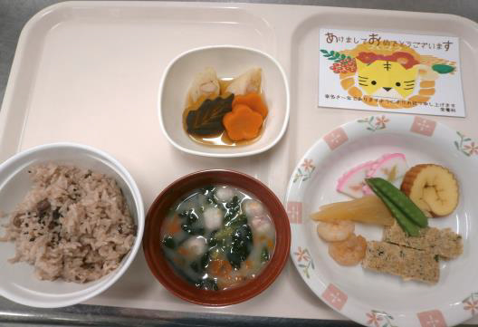 | 赤飯、盛り合わせ、炊き合わせ、雑煮風 | 黄金かれいの煮付け、紅白なます、黒豆 | 巻き寿司・稲荷寿司、牛肉とれんこんの金平、うまい菜とえのきの和え物、鰯のつみれ汁 | 白身魚のオーロラソース、玉ねぎとアスパラのサラダ、コンソメスープ、ロールケーキ |