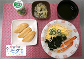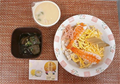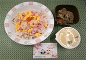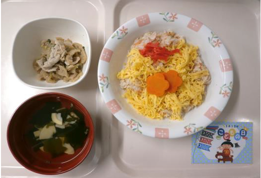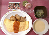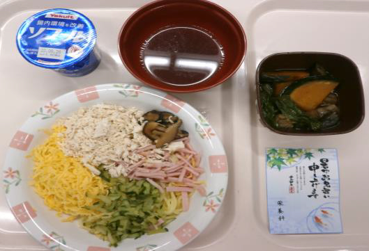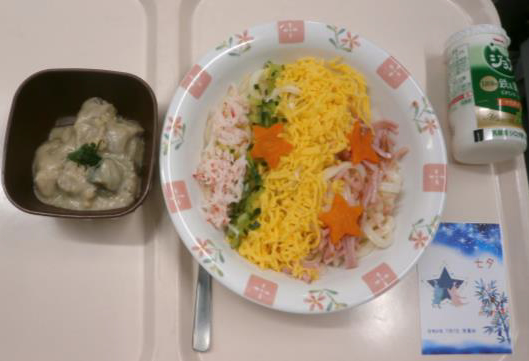 | 散らし寿司、れんこんと豚肉の炒り煮、鶏枝豆茶碗蒸し | オムライス(野菜ソース)、エビフライ、コンソメスープ、メロンゼリー | 稲荷寿司、七夕ソーメン、白菜と鶏肉の塩煮、ジョア | うな丼、胡瓜の浅漬け、赤だし味噌汁 |