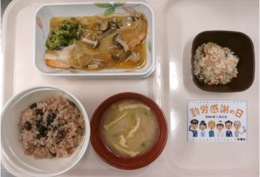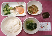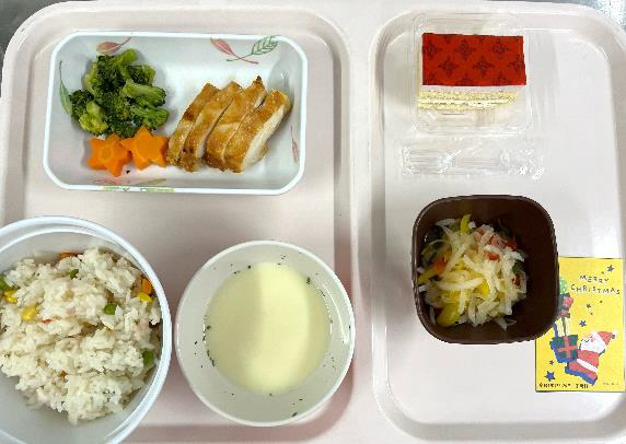 | 鮭の柚庵焼き、南瓜の含め煮、カリフラワーとインゲンのおからサラダ、味噌汁 | オムライス、鶏の唐揚げ、ブロッコリーの洋風お浸し、コーンポタージュ、ロールケーキ | 年越しそば、昆布大豆煮、ジョア |