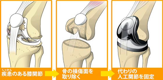 人工膝関節置換術とは、傷んで変形した関節を人工の関節に置き換える手術です。人工関節の表面は滑らかで神経もないため、この手術を受けることによって、関節は滑らかに動くようになり、痛みもほとんど感じなくなります。また、O脚やX脚に変形した膝が、手術によって真っすぐな膝になります。痛みなく歩けるようになると、日常生活を送りやすくなり、生活の質(QOL)を改善することができます。