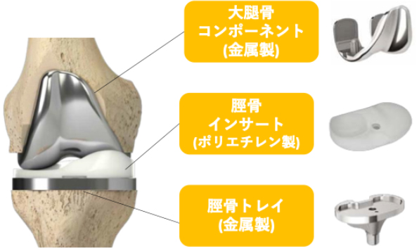 手術では、まず変形して傷んだ大腿骨と脛骨の表面の骨を切除します。大腿骨側と脛骨側の骨にそれぞれ金属製の人工関節(大腿骨・脛骨コンポーネント)を固定します。脛骨コンポーネントの上面に超高分子量ポリエチレン製の人工の軟骨(インサート)を設置します。人工膝関節は大腿骨コンポーネントとインサートの間で滑らかに動く構造になっています。