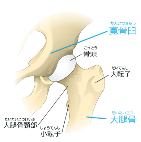 股関節は、「寛骨臼」と呼ばれる骨盤の受け皿の部分と、「大腿骨頭」と呼ばれる大腿骨の球の部分からなる、いわゆる球関節です。正常な股関節は寛骨臼も大腿骨頭も表面は「関節軟骨」というクッションで覆われており、痛みなく滑らかに関節を動かすことができます。股関節は「関節包」という袋に包まれており、その中にある「関節液」という液体が潤滑油の働きをしています。