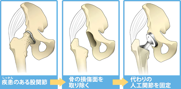 人工股関節置換術とは、傷んで変形した関節を人工の関節に置き換える手術です。人工関節の表面は滑らかで神経もないため、この手術を受けることによって、関節は滑らかに動くようになり、痛みもほとんど感じなくなります。痛みなく歩けるようになると、日常生活を送りやすくなり、生活の質(QOL)を改善することができます。