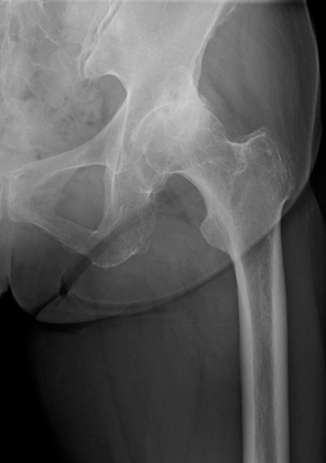 大腿骨頭への血流障害によって骨が壊死する疾患です。ステロイド剤を多量に服用していたり、アルコール摂取量が多いと発生しやすいと言われていますが、原因が特定できない場合もあります。初期には症状はあまりありませんが、進行すると大腿骨頭が陥没し、寛骨臼の破壊も伴うようになり、歩行が困難になります。