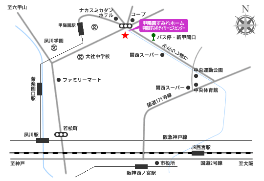 ●阪急 甲陽園駅より徒歩約8分 ●阪神 西ノ宮駅「2番乗り場」山手線東まわり 阪神バス「新甲陽口」下車 徒歩約1分 ●JR 西宮駅より徒歩5分「西宮警察署前」山手線東まわり 阪神バス「新甲陽口」下車 徒歩約1分