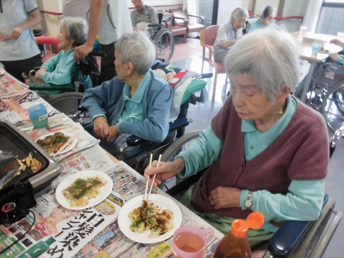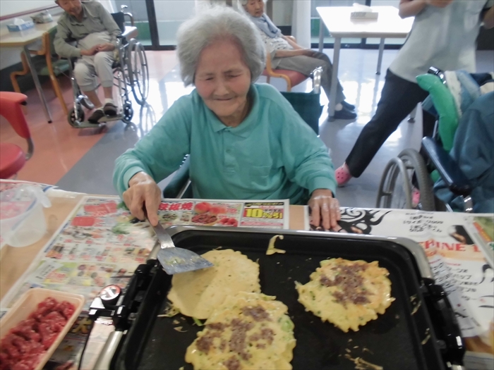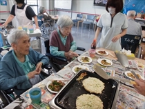 下ごしらえやお好み焼きをひっくり返したりと、利用者様と職員で一緒にお好み焼きを作りました。