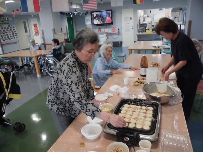 ホットプレートでたこ焼きを上手にクルクルと回され、大きなたこ焼きができました。