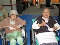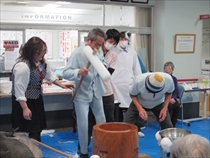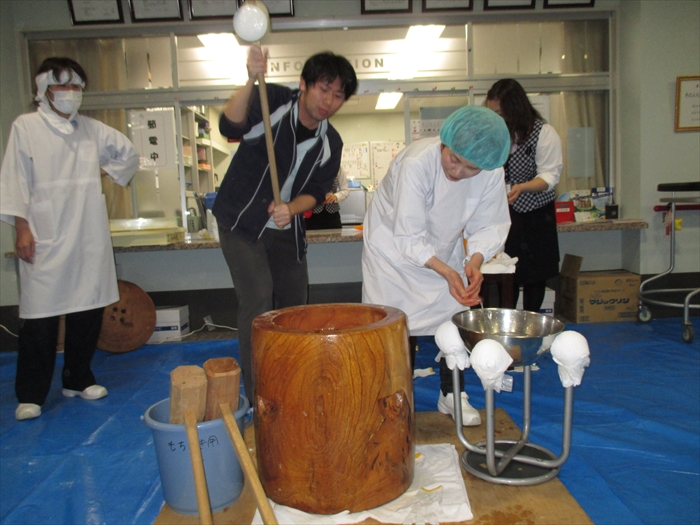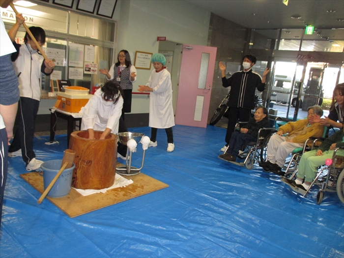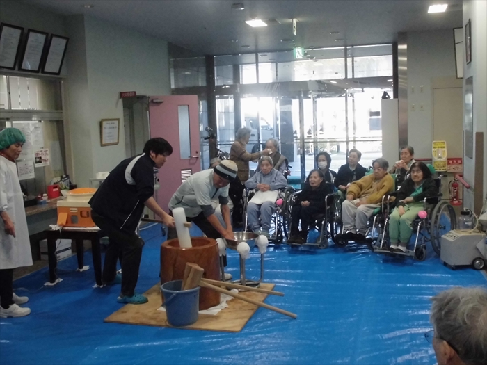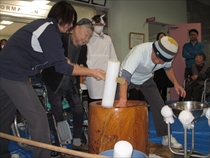 恒例の餅つき大会をしました。「よいしょ、よいしょ」のかけ声に合わせ力一杯お餅をつき、皆様につきたてを味わっていただきました。