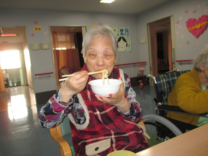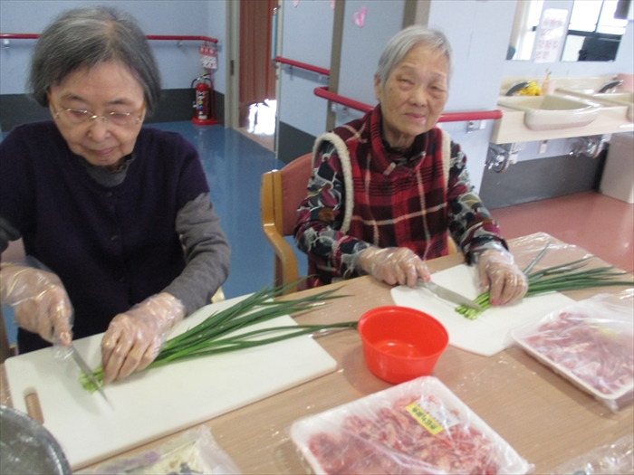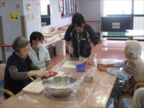 ネギなどの材料を職員と一緒に切っていただき、かす汁を作りました。今回は、中にうどんを入れてボリューム満点の、かす汁を召し上がって頂きました。