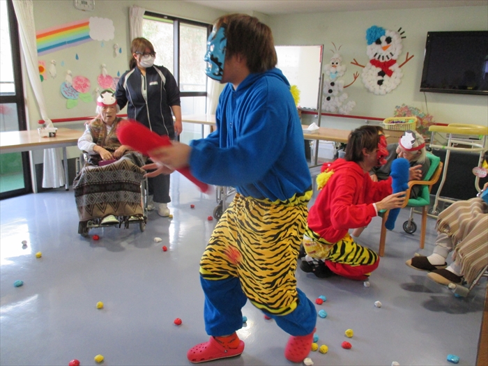 みなさん一緒に「鬼は~そと~福は~うち~」と豆に見立てたボールを投げて鬼退治をしました。 笑ってしまい上手に投げる事ができないくらい、楽しい豆まきとなりました。 今年も一年、無病息災で過ごせますように。
