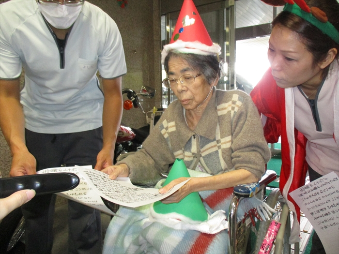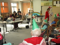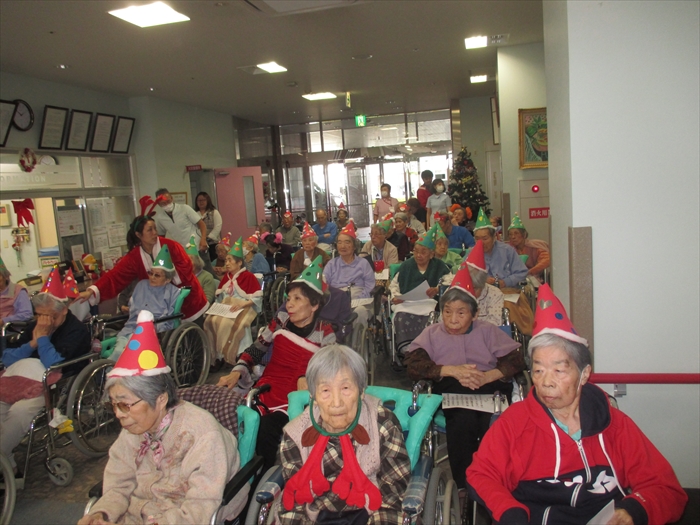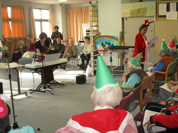 職員と一緒に作成したクリスマス用の三角帽子をかぶって、生演奏と歌を楽しみました。 「赤鼻のトナカイ」や「ジングルベル」を演奏に合わせて一緒に歌い、職員のトナカイやサンタの格好にも楽しまれていました。