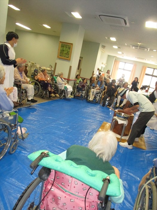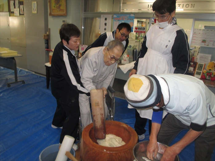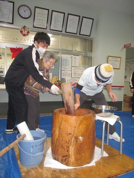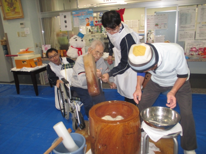 利用者様も職員と一緒にお餅をつかれ、楽しんで頂きました。