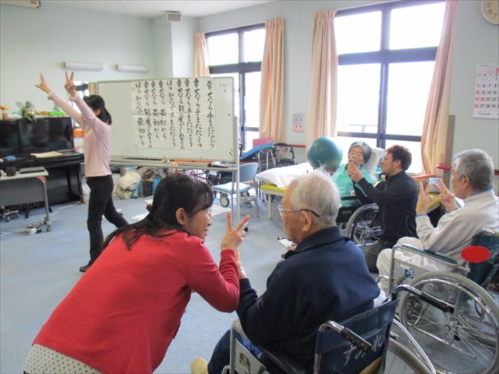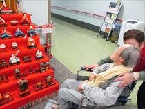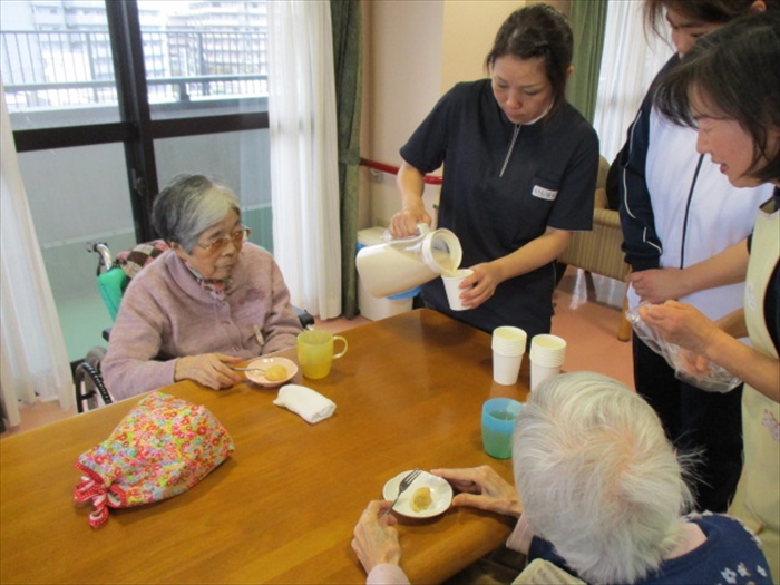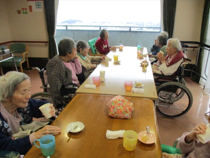 ひな祭りに時期によく聞く馴染みの曲を演奏に合わせて一緒に歌ったり、指や手を使った振付を職員と一緒に楽しみました。またフロアに飾られた雛人形を見て「すごい綺麗ね」「立派なやつが飾ってある」と昔を思い出され、懐かしむ方もおられました。 また、おやつの時間はできたての甘酒を飲んでいただき「美味しい」「なんかほっとする味やね」とひな祭りを五感で感じていただきました。