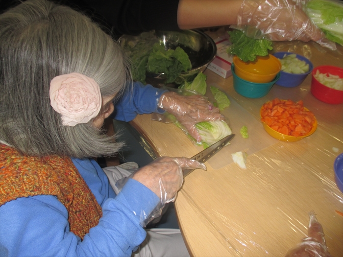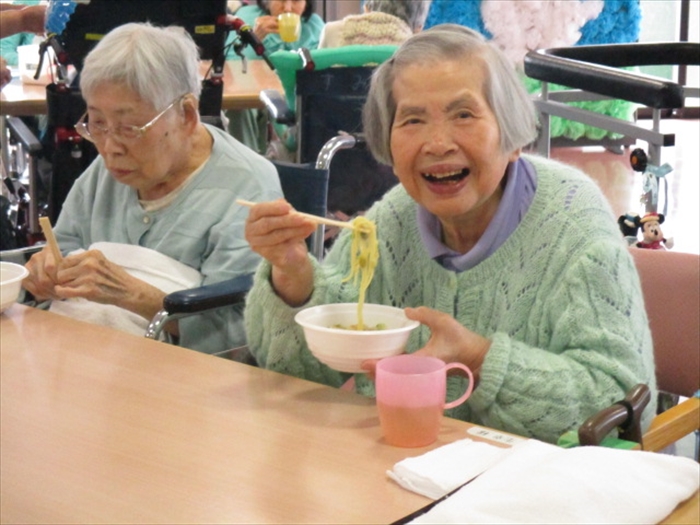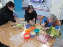 下準備として野菜を切った際には「こんなの久しぶりやね」「これ(ネギ)は細かく切らんとアカン」とみなさん久しぶりの料理に目を輝かせておられました。また完成したラーメンを食べて「美味しい!もっとほしいね」と会話もはずみ、美味しく楽しい食事になりました。