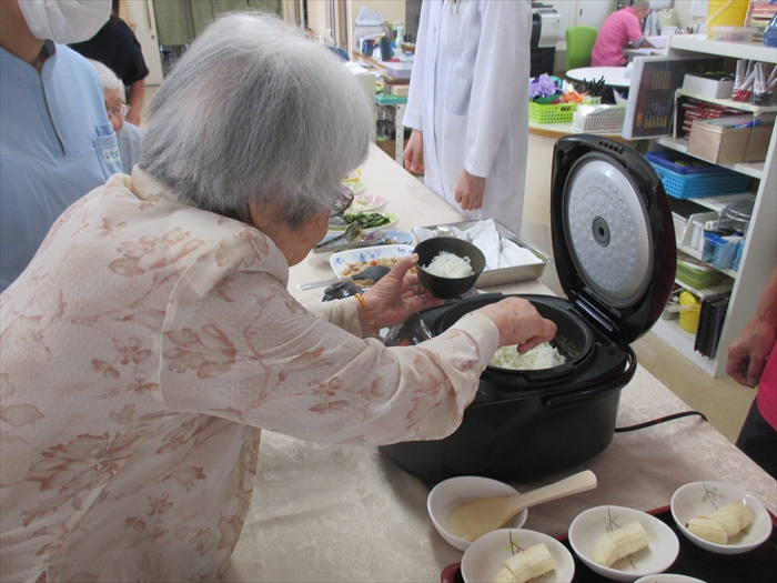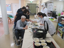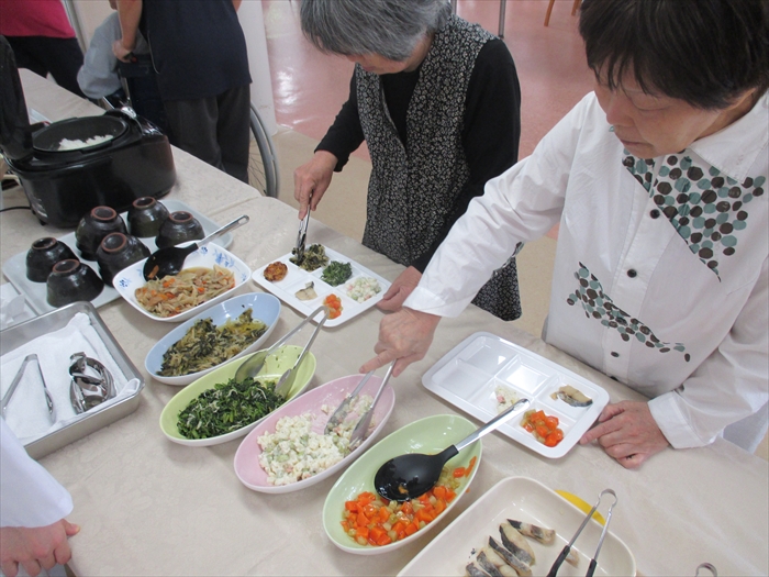 この度、デイケアで昼食バイキングをはじめました。たくさんある料理から好きな料理を選んでいただき、ご自身で盛り付けてもらいました。 「美味しいし、楽しいね」「こんなの初めてやわ」「おかわり食べようかな」と皆さん大好評でした。