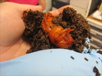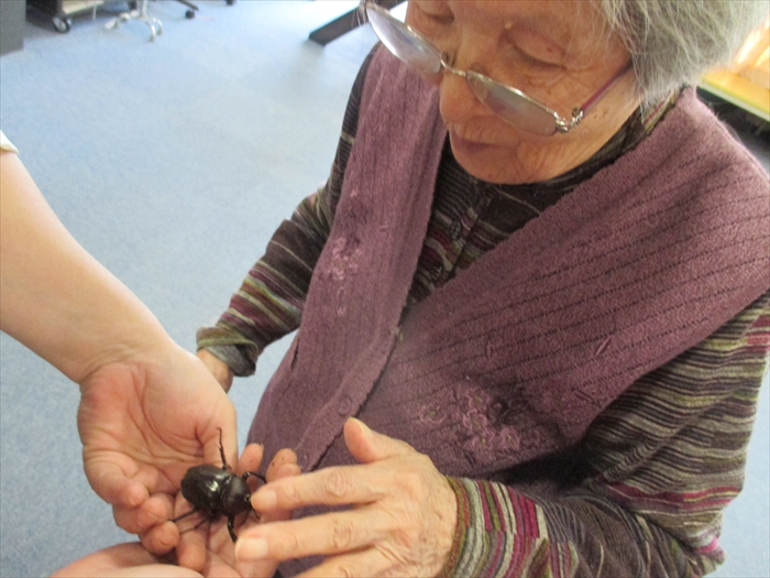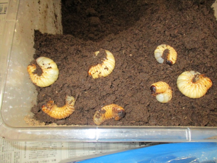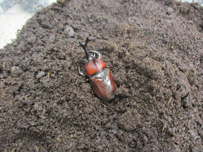 昨年すみれ苑に迷い込んだカブト虫が卵を産み、ふ化、幼虫となり、冬を越し、ようやく5月に成虫になりました。 オス3匹、メス2匹、ゼリーを食べて元気いっぱいです!