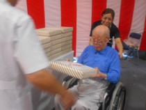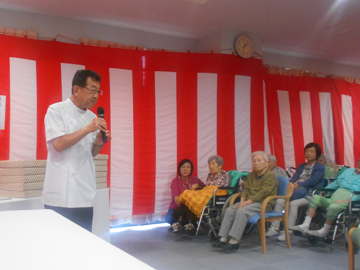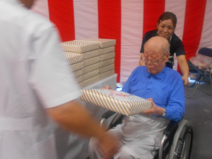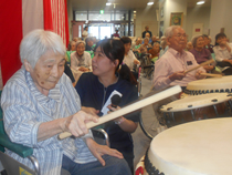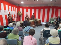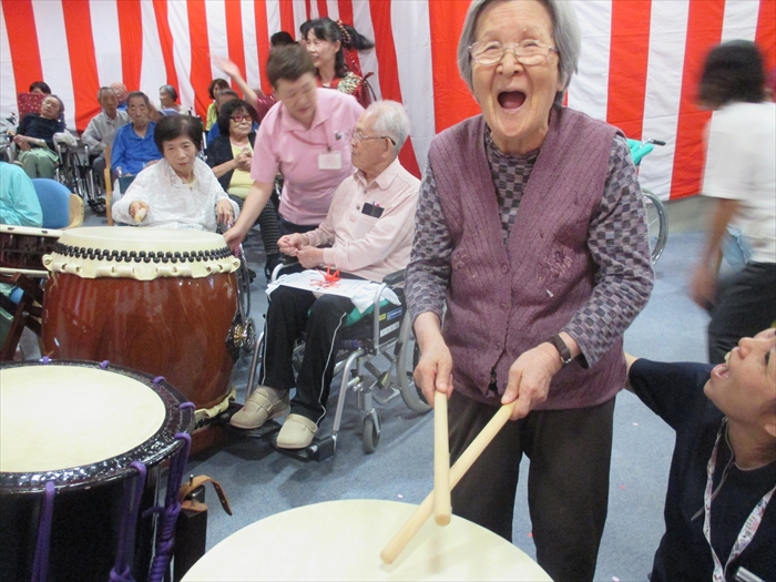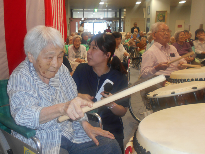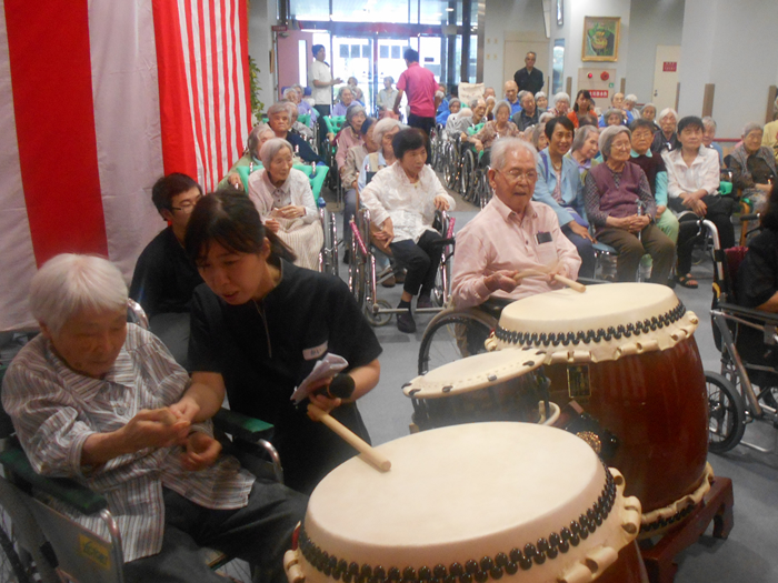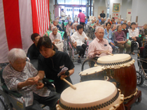 ご長寿のお祝いをいたしました。 今後益々のご健康とご多幸をお祈りいたします。 お祝いの和太鼓演奏では、迫力のある音色に感動され、手拍子や足でリズムをとられていました。最後には実際に叩かせてもらい、会場が一体となりました。