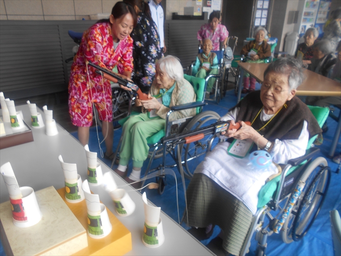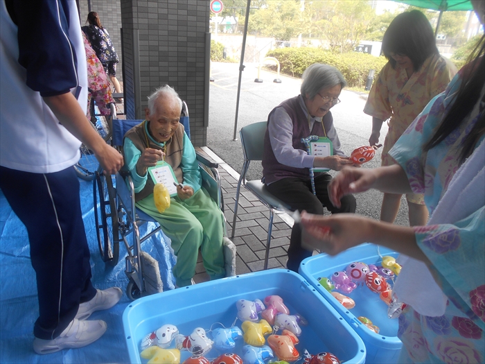 たこ焼き・焼きそば・アメリカンドッグ・フライドポテト・射的・ヨーヨー釣りなどの様々な模擬店やピアノとフルート演奏や和太鼓などの催し物を楽しみました。 14時からのピアノは当苑の看護師が演奏しました。